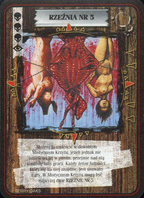 RZEŹNIA NR 5, na której jest napisane, że jeśli zagramy ją do Mistycznego Krzyża przeciwnika, przejmie on nad nią kontrolę. Zdolności zapisanych na tej karcie nie różnicuje kto z nich korzysta, dlatego prawdopodobnie chodzi o sytuacje z kartami dołączonymi. Dokładając np
