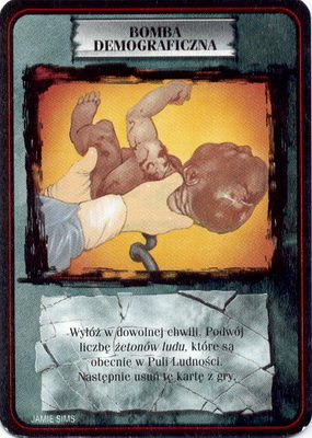 BOMBA DEMOGRAFICZNA. Ona co prawda pozwala podwoić liczbę żetonów, ale tylko takich, które są w Puli Ludności. Jeśli tam są jeszcze jakieś dostępne, możemy je werbować bez niczyjej łaski. My chcemy ratować się w sytuacji, kiedy nie ma już czego werbować ani nie posiadamy wystarczającego arsenału, aby wyszarpnąć je z rąk przeciwników. Dużego wyboru nie ma, ale wystarczy to co jest.