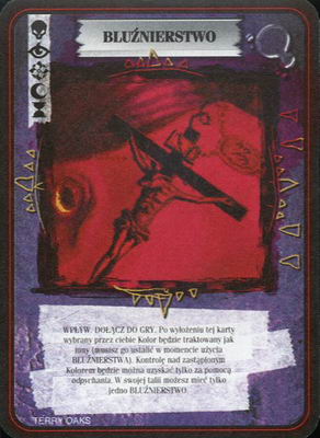 - Zagranie BLUŹNIERSTWA na kluczowy kolor przeciwnika potrafi ustawić grę pod nasze dyktando. Szczególnie, że są Arkana mające dwa a nawet trzy kolory jednego typu – BLUŹNIERSTWO neguje je wszystkie. Co zabawne, zwykle takie Arkana nie są zbyt mocne z uwagi na PRZYWIĄZANIE do konkretnego koloru i braku odpowiednio mocnych kart z tym związanych. Zagrane BLUŹNIERSTWO umocni przeciwnika w przekonaniu, żeby więcej nimi nie grać