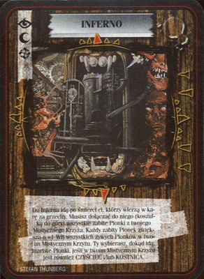 - Combo BUŹKA MANCUSI (wrzucony uprzednio na discard) i ZWŁOKI pozbędą się niemal każdej istoty przeciwnika. Problem ze ZWŁOKAMI jest taki, że zwykle pionki jednak na ten discard nie trafiają. Jak już giną, to dołączane są do INFERNA, OSOBISTEGO PIEKŁA czy innego CZYŚĆCA i ZWŁOKI finalnie nie sumują się do sensownego WB, które może zaszkodzić przeciwnikowi.