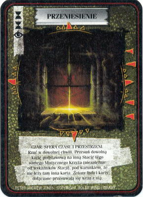 PRZENIESIENIE – pozwala przenieść dowolną kartę bez zwracania uwagi na wskaźniki Stacji w obrębie tego samego Mistycznego Krzyża. Najmocnijsza, gdy zagrana na własną kartę leżącą w Obsadzie i posiadającą żeton ludu aby ją przenieść na Scenę – tuż przed fazą przyciągania – pozwoli to w jednej turze przenieść żeton z Obsady do Piasty. Zagrane na kartę z więcej niż jednym żetonem ludu i poprawienie